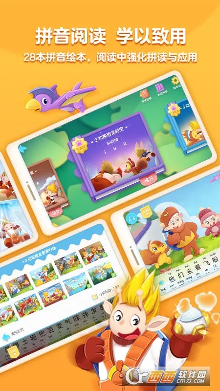 它紧贴部编版小学一年级语文教材,设计情景交互,帮助孩子关联记忆,高效学习。精心设计的100个互动情景,涵盖众多主题,能提高孩子认知能力,让孩子在趣味操作中巩固拼读成果。为每个拼音定制的原创儿歌,好听好记,能强化孩子对音形的记忆。还有原创3D恐龙角色,孩子可在互动中收集,轻松完成拼音拼读课程,为孩子日后学习打下良好基础。