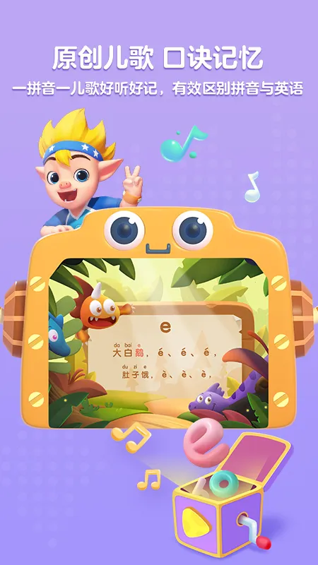 快乐儿歌,口诀记忆:为每个字母定制拼音儿歌,旋律轻快、歌词贴切,让孩子轻松上口,好听好记,轻松区分拼音与英文字母。