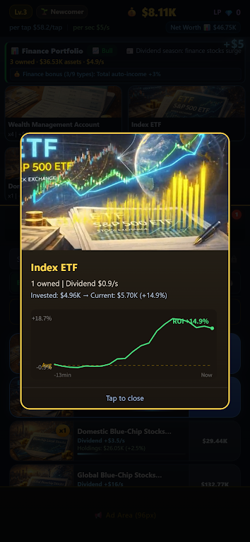 3. 投资项目多样收益:投资系统含39种产品,涉及多领域。玩家根据市场判断投资,离线时收益也自动累积,稳定增长财富,丰富闲置玩法体验,登录看到增值资产,成就感满满,还保障后续资金。