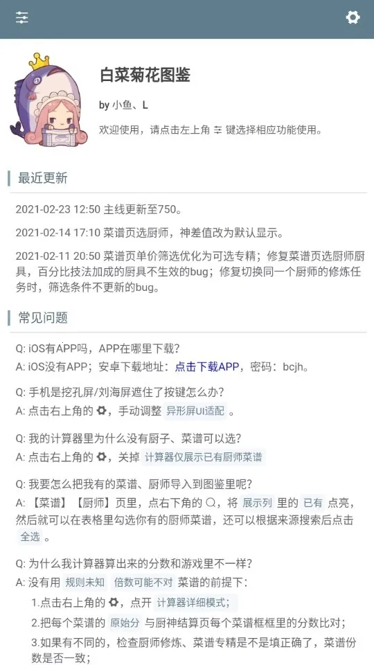 白菜菊花计算器是游戏辅助工具,有庞大图鉴系统。每周五厨神大赛可自动匹配最佳阵容,还能查贵客需求。能保存记录,界面清晰易上手,有图鉴管理等功能,亮点众多,还解答了常见问题。