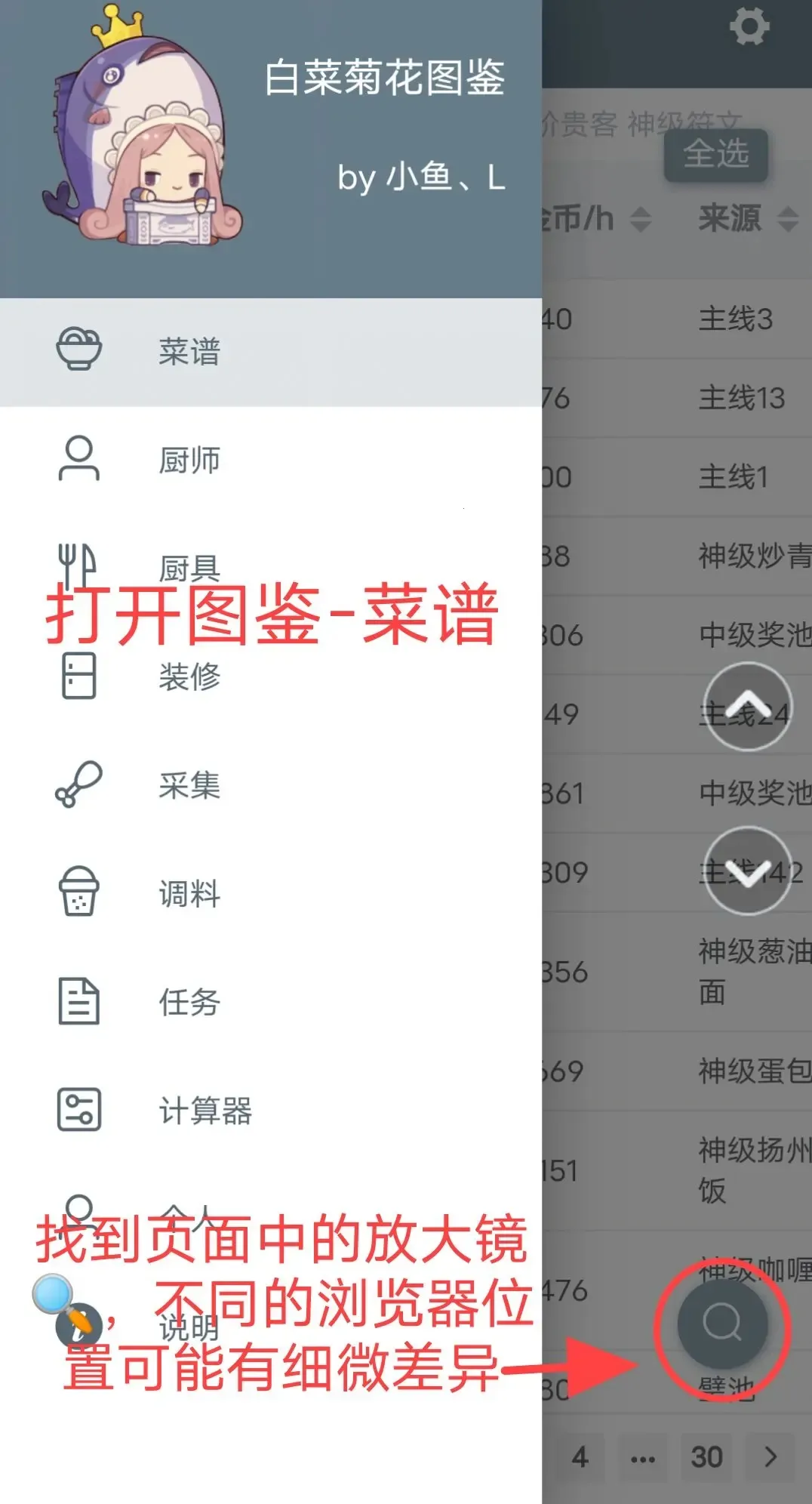 1、进入图鉴菜谱页面后,先找到界面中的放大镜入口。